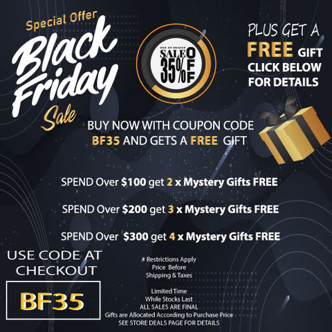 This Black Friday reward offer includes 3 mystery gift tiers only — and gift rewards activate only when BF35 is applied at checkout, while stocks last:
