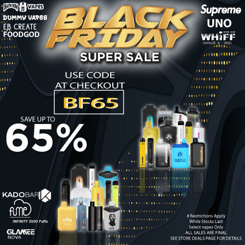 Unlock 65% OFF select disposable vapes ONLY when checking out with code: BF65